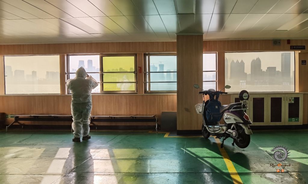 2020年4月8日清晨,武汉江城2号的轮渡上,一名市民站在窗边。曹旭 摄
